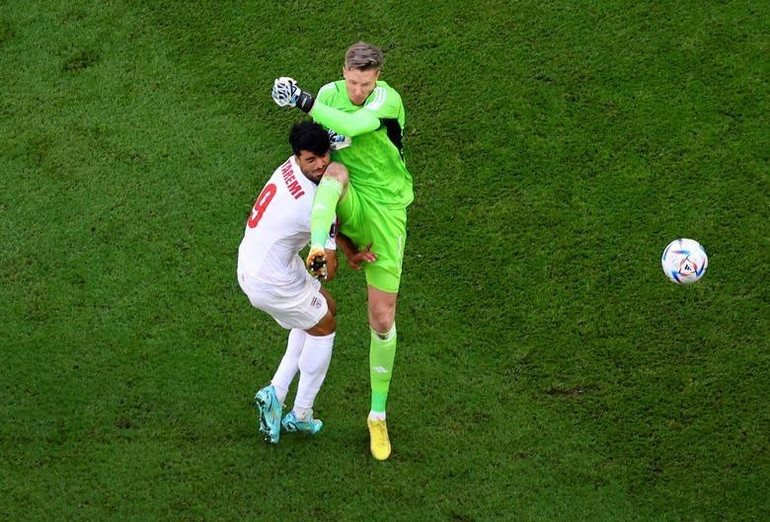 Thủ thành Xứ Wales Wayne Hennessey phạm lỗi với cầu thủ Mehdi Taremi bên phía Iran.