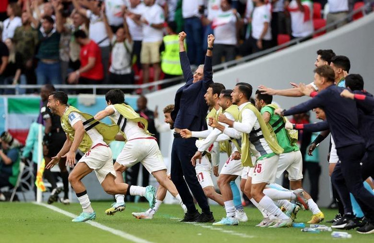 Hậu vệ Ramin Rezaeian ăn mừng cùng đồng đội sau khi ghi bàn thắng thứ 2 cho Iran ở phút 90+11 trong trận gặp Xứ Wales.