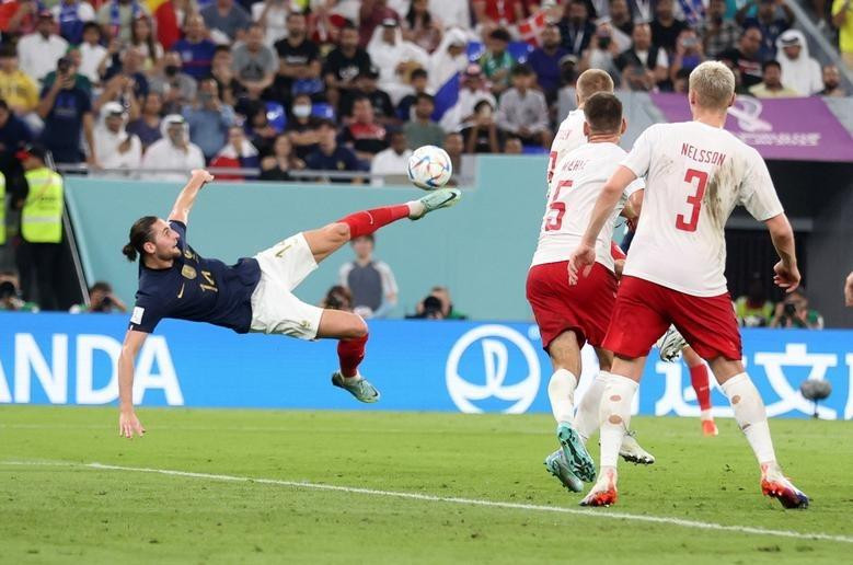 Cú dứt điểm của Adrien Rabiot (Pháp) trong trận gặp Đan Mạch.