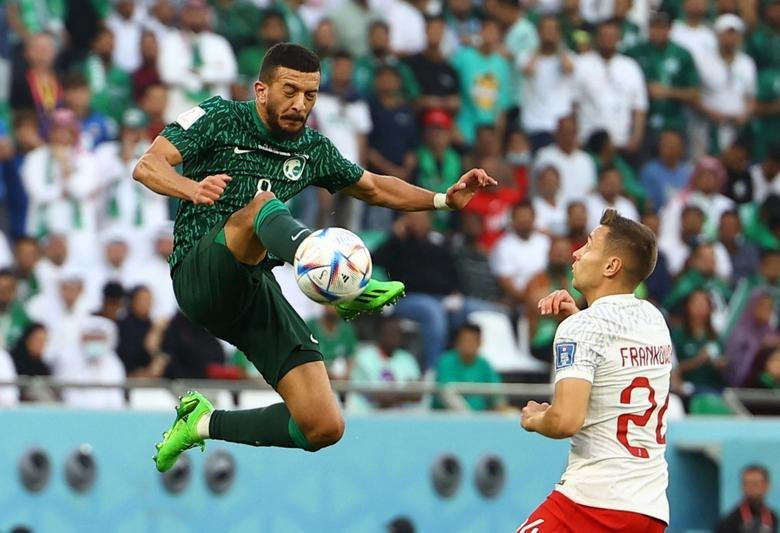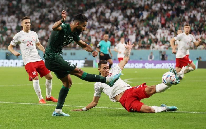 Hậu vệ Jakub Kiwior (Ba Lan) ngăn cản cú sút của tiền đạo Saleh Al-Shehri (Saudi Arabia).