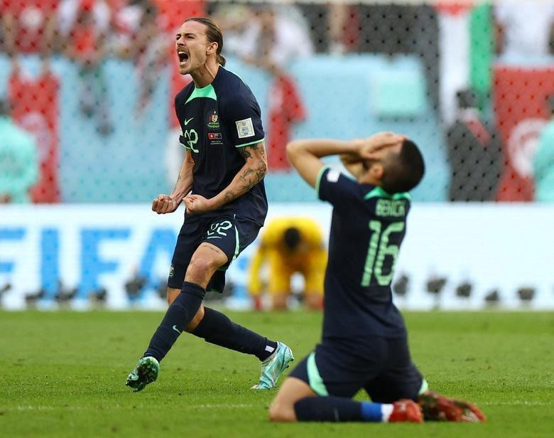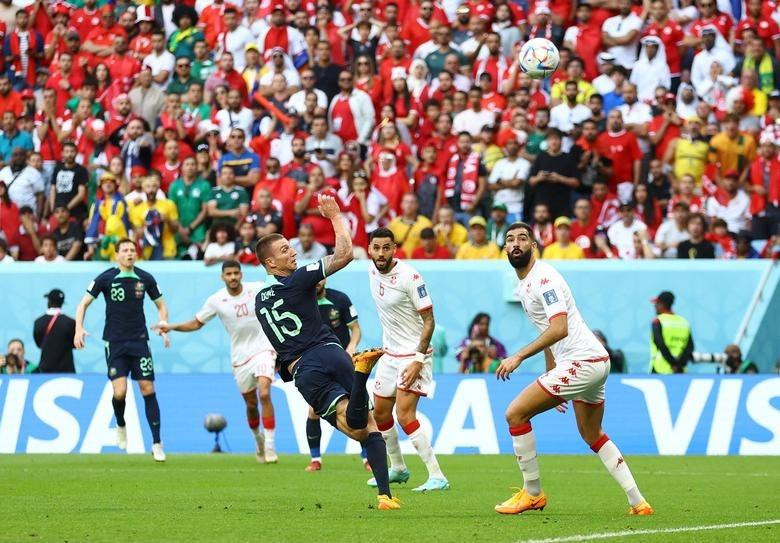 Tiền đạo Mitchell Duke (Australia) ghi bàn thắng mở tỷ số vào lưới Tunisia.