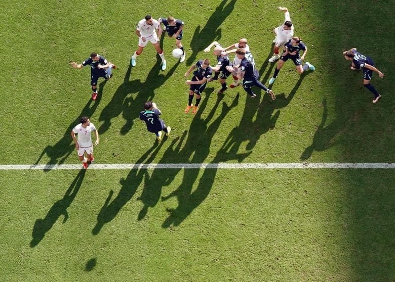 Một tình huống tranh chấp bóng trong trận Tunisia - Australia.