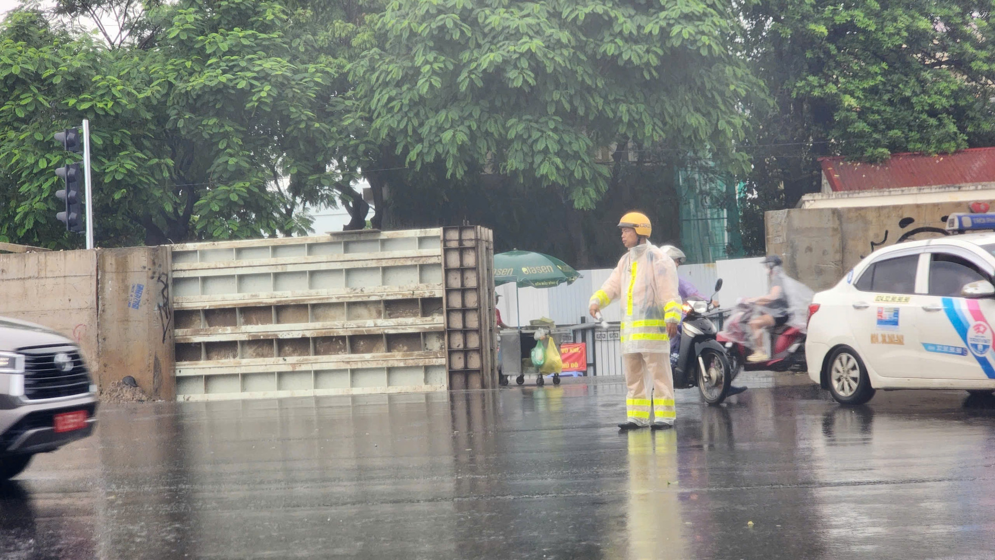 | Nước dâng cao ngập một nửa hàng rào bao quanh một công trình bên phía ngoài đê An Dương Vương. |