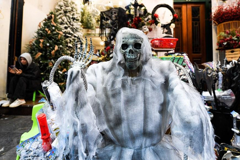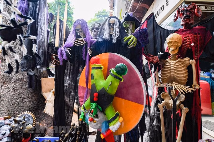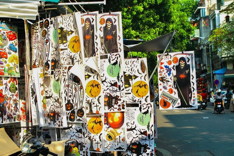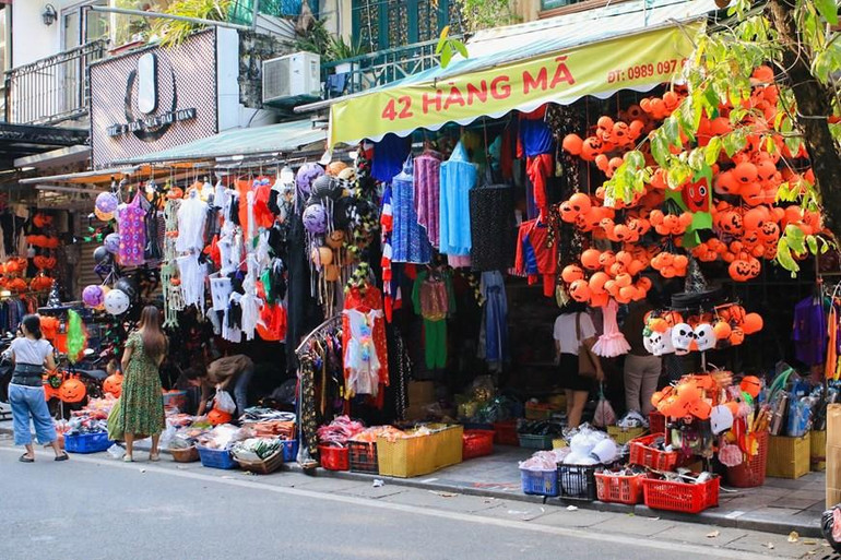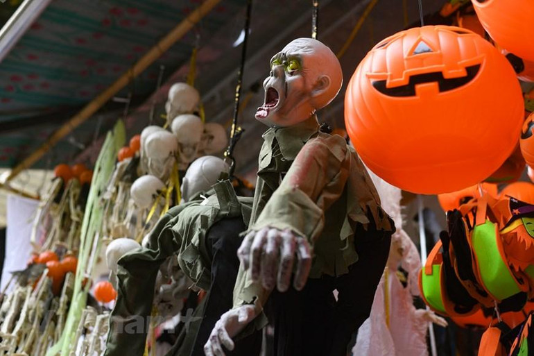 Những ngày Halloween cận kề, trên phố Hàng Mã (quận Hoàn Kiếm, Hà Nội) bày bán ngập tràn các mẫu mã đồ chơi, trang phục hóa trang đủ sắc màu như mặt nạ, nón phù thủy, hình nộm, bộ xương, lưỡi hái...