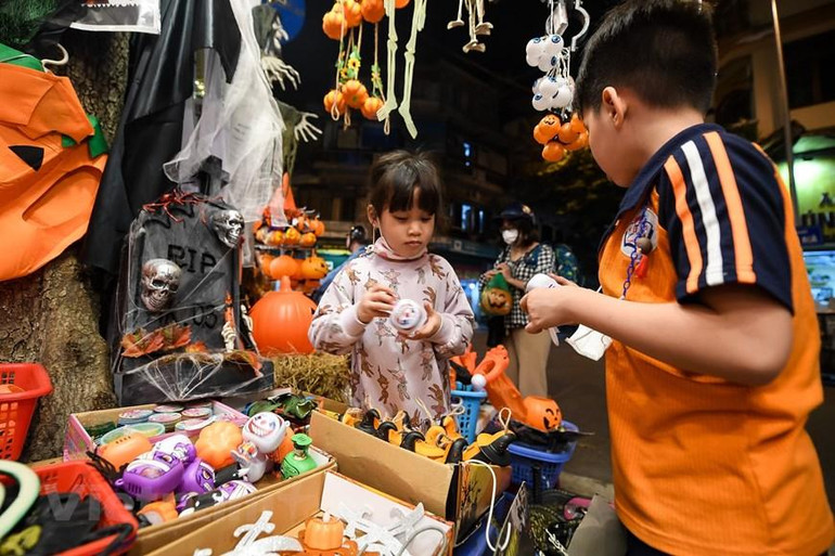 Các em nhỏ rất hào hứng và thích thú với những món đồ chơi nhân dịp lễ hội hóa trang.