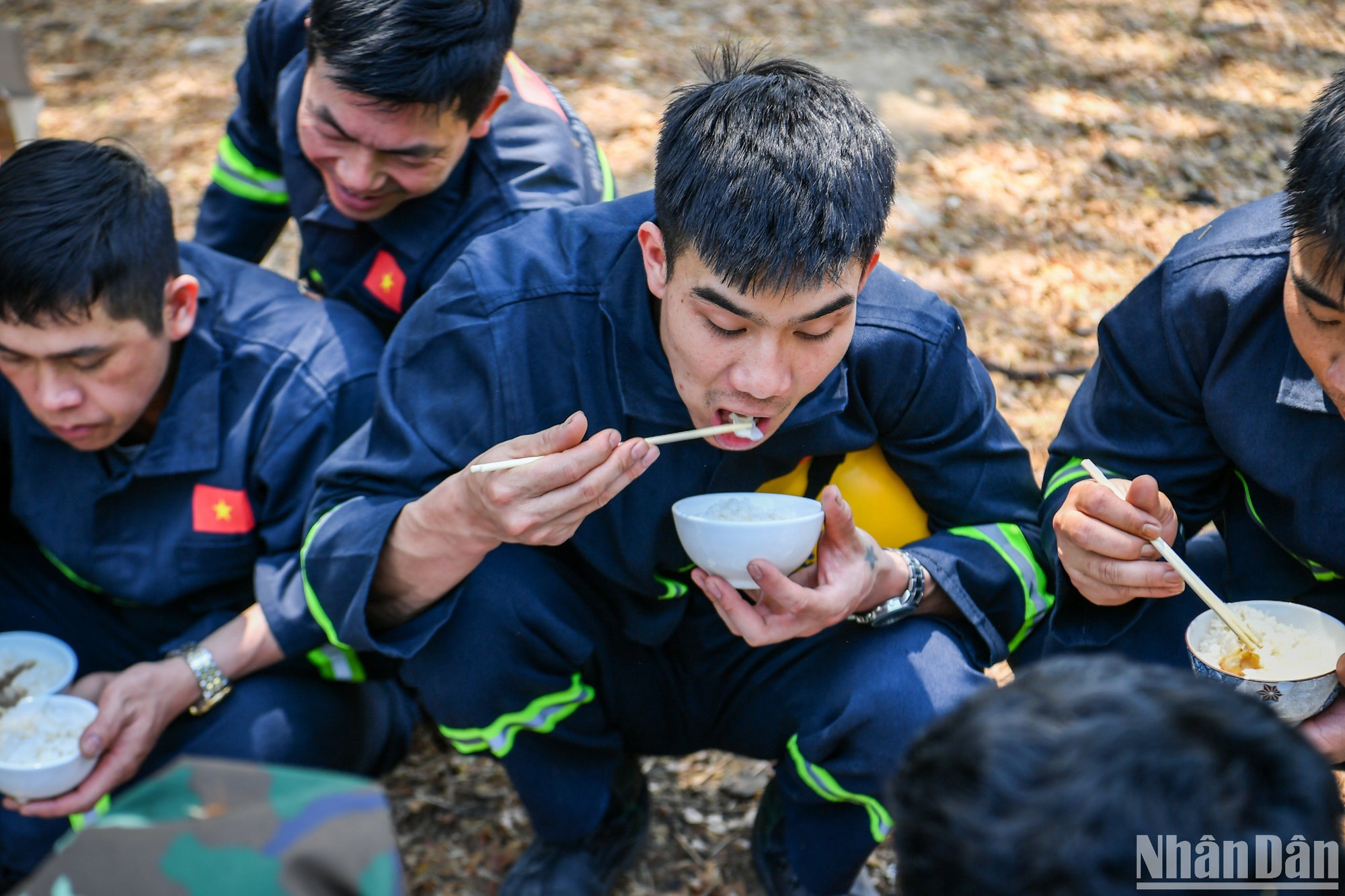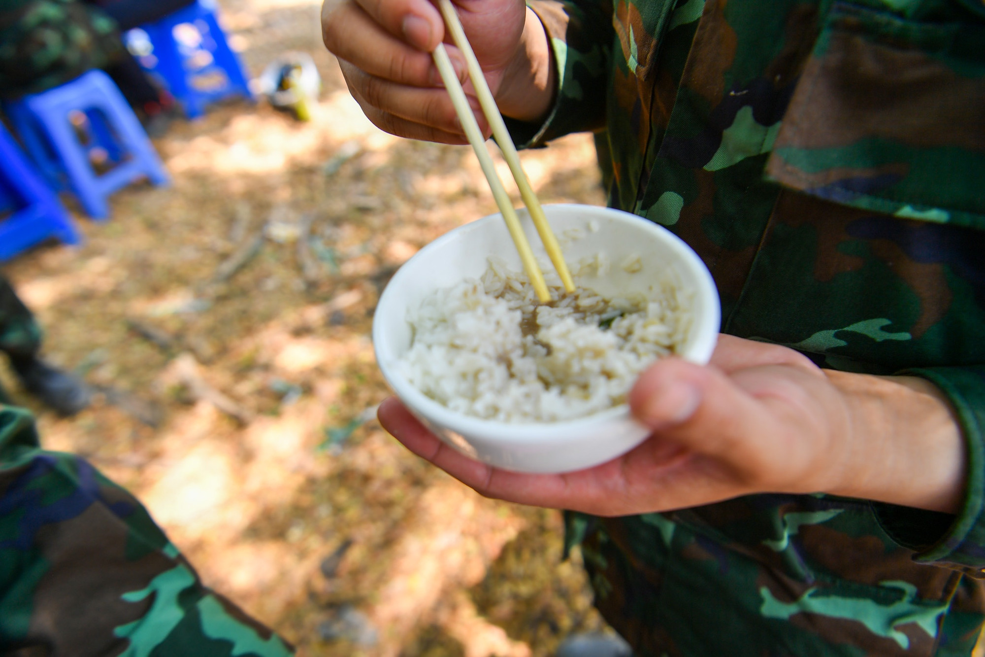 | Dưới cái nắng lên tới 40 độ C tại Nayipydaw (Myanmar), lực lượng cứu nạn, cứu hộ Quân đội nhân dân Việt Nam tranh thủ ăn cơm để chuẩn bị vào ca làm việc buổi chiều. |