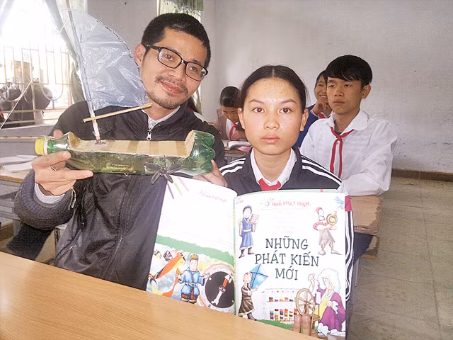 Nguyễn Quang Thạch vui khấp khởi. Anh gọi điện đi mấy nơi, tíu tít kể chuyện cô bé Nguyễn Thị Lanh, học sinh lớp 9, Trường THCS Thụy Liên tự làm một chiếc thuyền bằng chai nhựa, chạy được bằng động cơ. Lanh học theo mẫu trong sách “Tập làm phát minh” của tủ sách lớp, nhưng sáng tạo ở chỗ sách chỉ hướng dẫn làm mô hình, còn em “chế” được cả động cơ. Thạch thích lắm, phấn chấn như chính sản phẩm của mình. Loay hoay chụp ảnh chiếc thuyền chưa “đã”, anh còn mang ra bể nước sau trường… chạy thử.