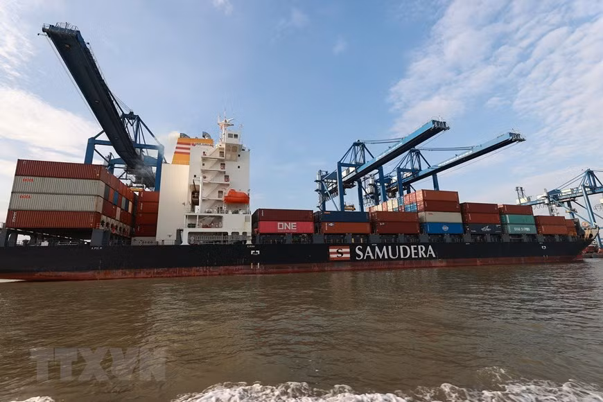 Tàu ra vào bốc dỡ hàng hóa ở cảng Tân Cảng Cát Lái. (Ảnh: TTXVN)