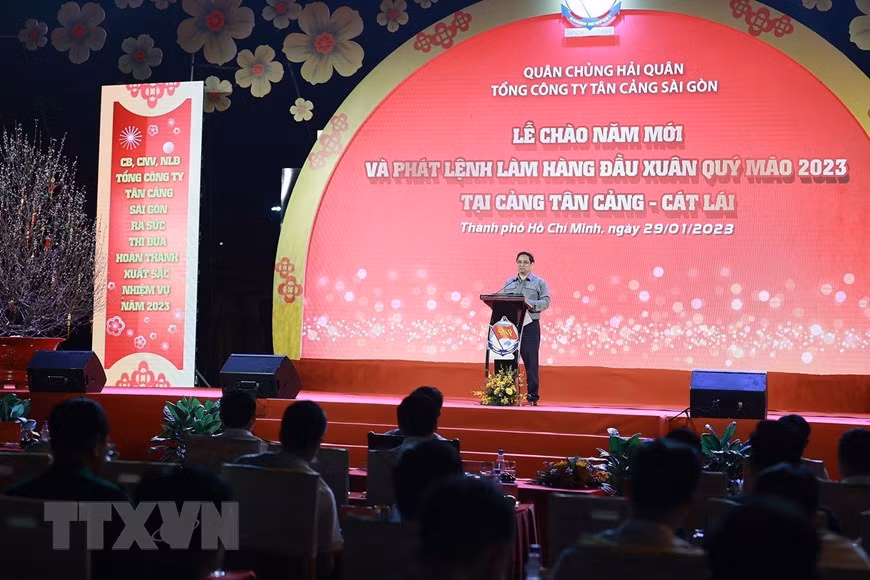 Thủ tướng Phạm Minh Chính phát biểu tại Lễ phát lệnh làm hàng đầu năm của Tổng Công ty Tân Cảng Sài Gòn. (Ảnh: TTXVN)