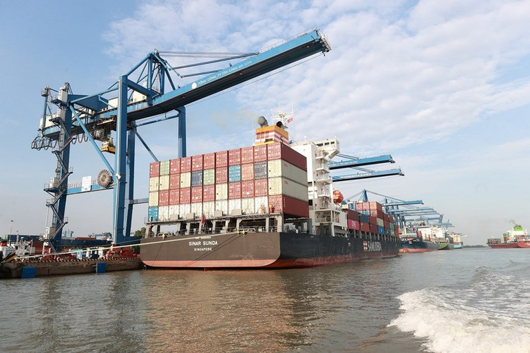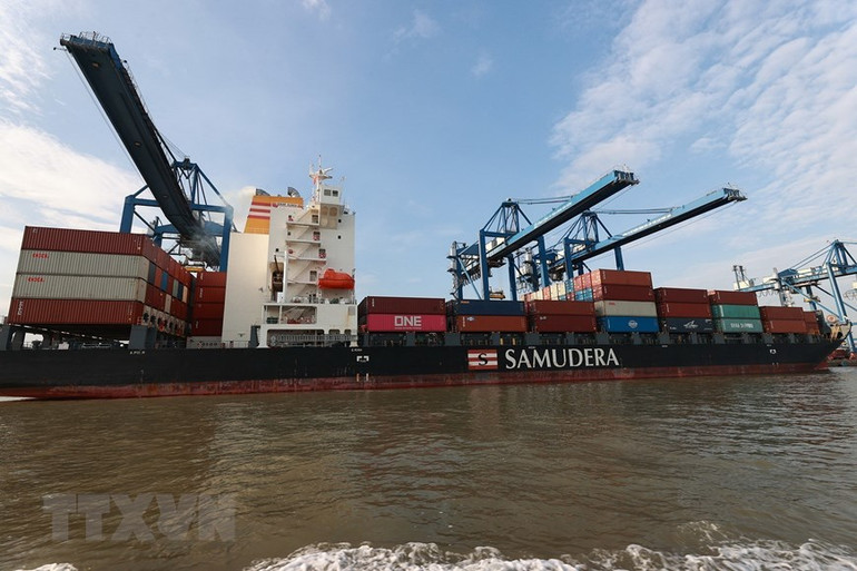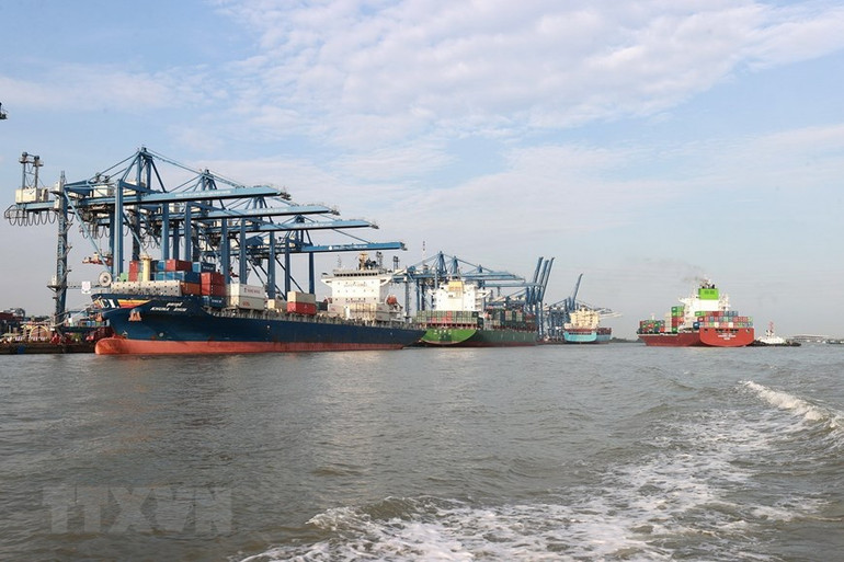 Tàu ra vào bốc dỡ hàng hóa tại cảng Tân Cảng Cát Lái. (Ảnh: TTXVN)