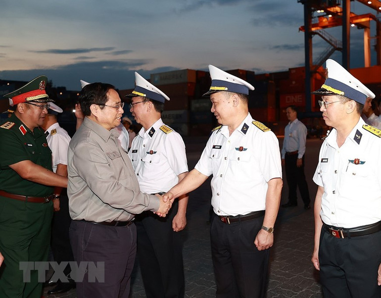 Thủ tướng Phạm Minh Chính với cán bộ, sĩ quan Tổng Công ty Tân Cảng Sài Gòn. (Ảnh: TTXVN)