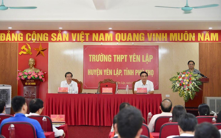 | Thủ tướng Phạm Minh Chính phát biểu tại buổi làm việc với giáo viên và học sinh Trường THPT Yên Lập |