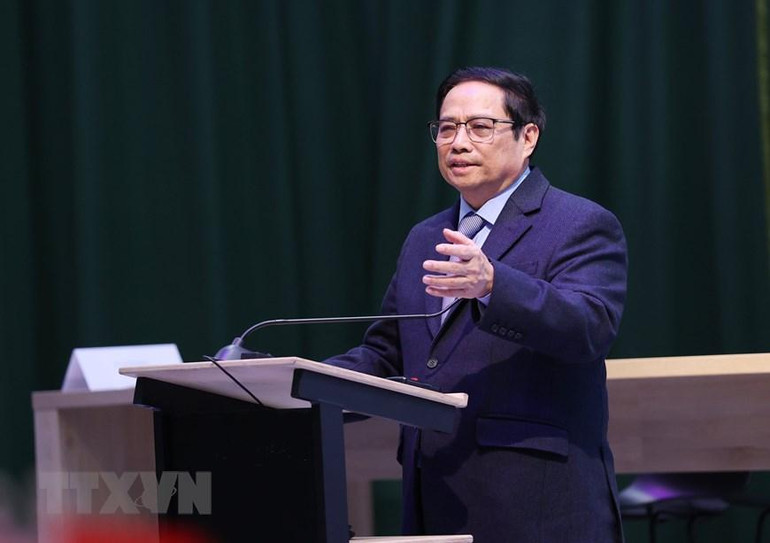 Thủ tướng Phạm Minh Chính phát biểu Hội thảo Bàn tròn “Đổi mới sáng tạo và Sản xuất công nghệ cao” với các CEO Khu công nghệ cao Brainport. (Ảnh: Dương Giang/TTXVN)