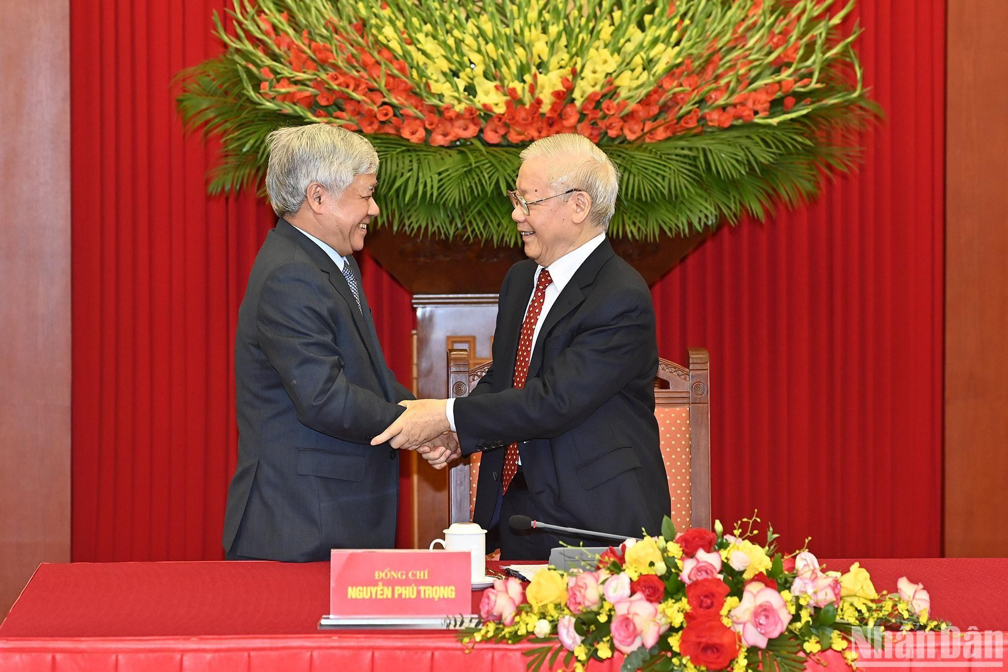 Đồng chí Đỗ Văn Chiến, Bí thư Trung ương Đảng, Chủ tịch Ủy ban Trung ương Mặt trận Tổ quốc Việt Nam tặng hoa cảm ơn Tổng Bí thư Nguyễn Phú Trọng.