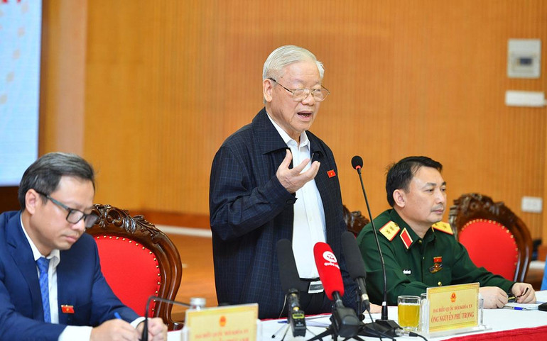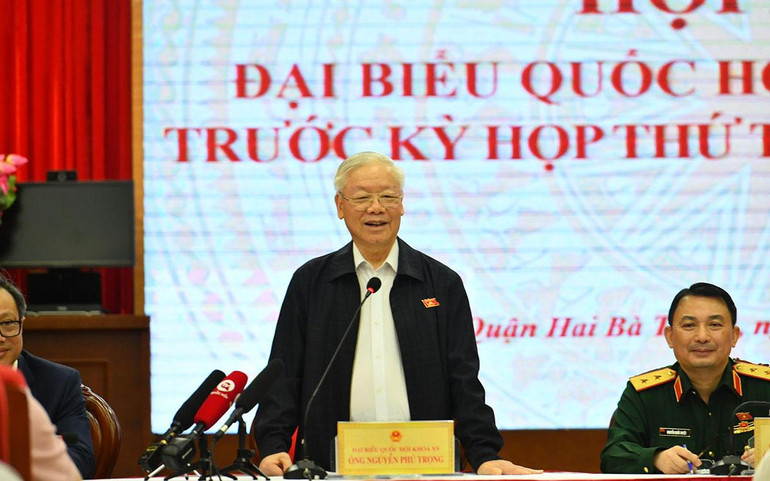 | Tổng Bí thư Nguyễn Phú Trọng phát biểu tại buổi tiếp xúc cử tri đơn vị bầu cử số 1, Thành phố Hà Nội. |