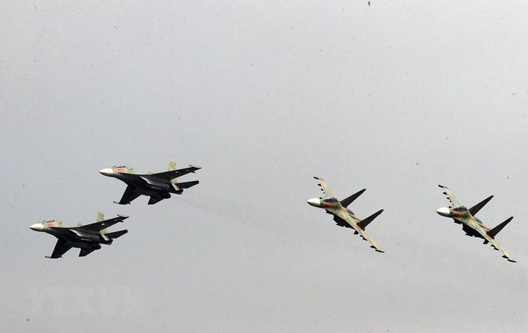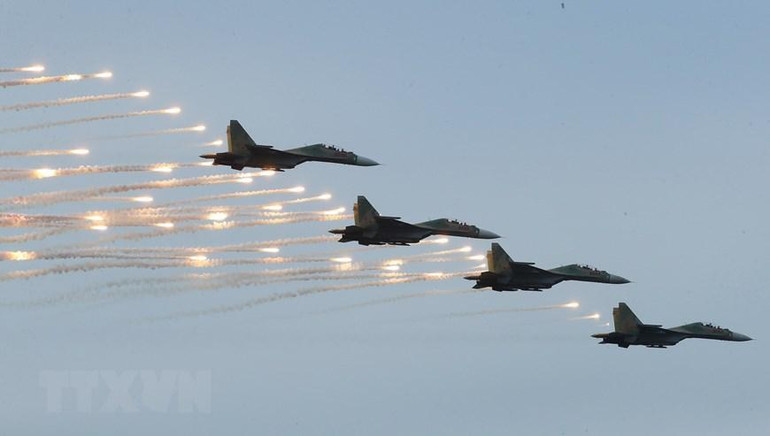 Đội hình máy bay Su30 MK trình diễn trong ngày tổng duyệt. (Ảnh: Trọng Đức/TTXVN)