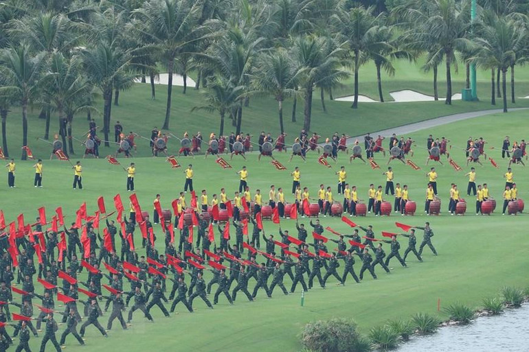 Màn đồng diễn của các lực lượng sẽ thể hiện trong lễ khai mạc triển lãm. (Ảnh: Trọng Đức/TTXVN)