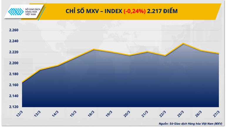 Sắc đỏ chiếm ưu thế đã kéo chỉ số hàng hoá MXV-Index giảm 0,24% xuống 2.217 điểm. Trong đó, toàn bộ 5 mặt hàng năng lượng đều giảm giá, mạnh nhất là khí tự nhiên.