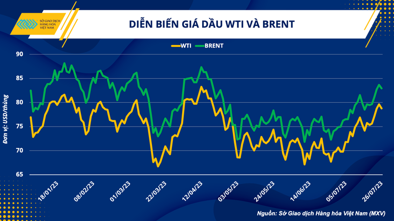 Giá dầu tiếp tục chuỗi tăng mạnh nhất kể từ tháng 3 tới nay. Theo Sở Giao dịch Hàng hóa Việt Nam (MXV), tính từ đầu tháng 7, giá WTI đã hồi phục 11,73% lên 78,78 USD/thùng, giá dầu thô Brent đã hồi phục 9,96% lên 82,92 USD/thùng, đánh dấu tháng tăng mạnh nhất kể từ tháng 5/2022.