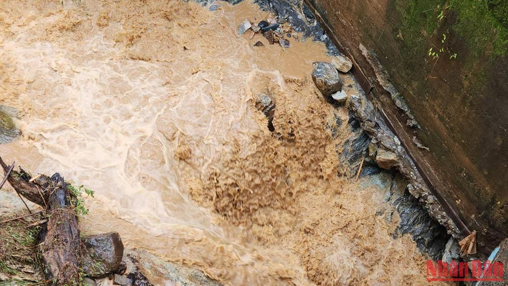 Hình ảnh nước lũ chảy xiết, ghi nhận sáng 28/9, tại cây cầu trên Tỉnh lộ 678, đoạn qua địa bàn thôn Đắk Pet 1, xã Đắk Na, huyện Tu Mơ Rông, tỉnh Kon Tum.