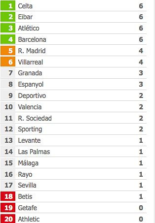 * Bảng xếp hạng La Liga BBVA 2015-2016 sau hai vòng đầu: