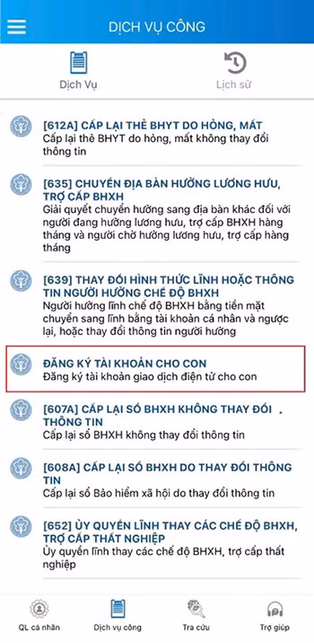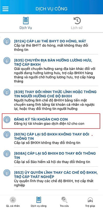 Bước 3: Chọn dịch vụ Đăng ký tài khoản cho con.