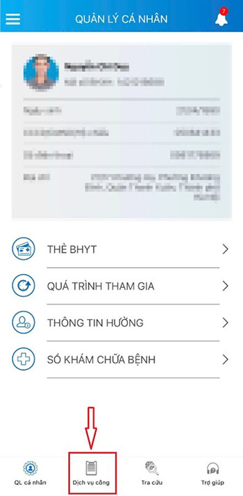 Bước 2: Tại giao diện quản lý cá nhân: Chọn Thẻ bảo hiểm y tế