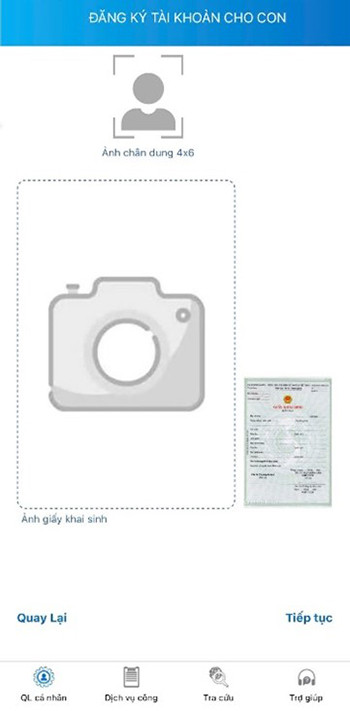 Bước 5: Tải ảnh chân dung 4x6 và ảnh Giấy khai sinh theo hướng dẫn rồi bấm “Tiếp tục”.