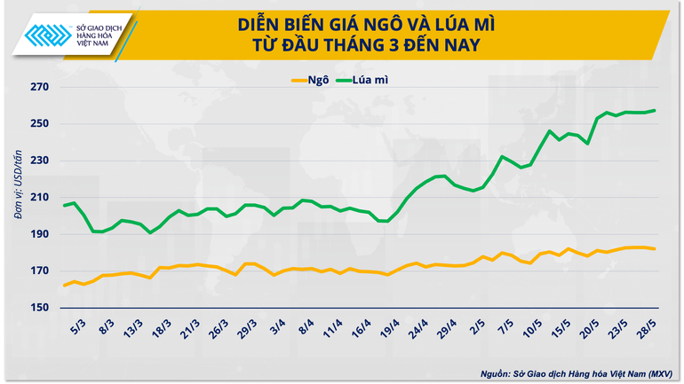 Giá ngô, lúa mì Chicago lần lượt ghi nhận các đợt tăng mạnh lên mức cao nhất kể từ cuối tháng 8/2023. Đà tăng vẫn chưa có dấu hiệu dừng lại khi lo ngại về nguồn cung tại các nước sản xuất lớn không ngừng gia tăng, đặc biệt là hiện tượng sương giá gần đây ảnh hưởng nghiêm trọng tới vụ lúa mì của Nga và rủi ro khi mùa vụ của Mỹ bước vào giai đoạn phát triển quan trọng.