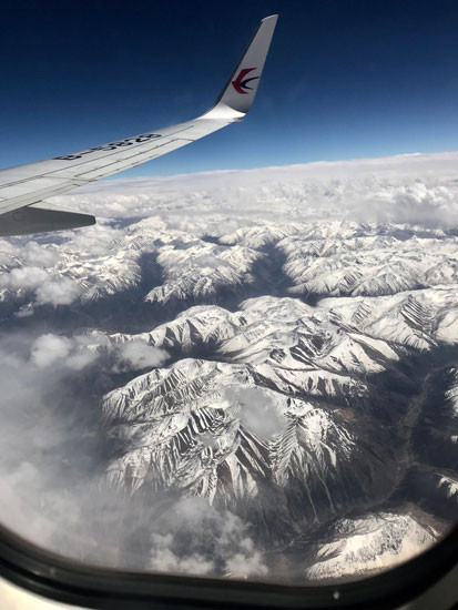 Nhìn qua cửa sổ máy bay, Tây Tạng mênh mông một màu tuyết trắng. Điều kiện tự nhiên quá khắc nghiệt khiến phần lớn dải tuyết sơn gần như không có chút dấu hiệu nào của sự sống.