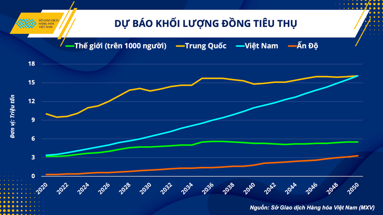 Theo dự báo của Tổ chức nghiên cứu đồng quốc tế, nhu cầu tiêu thụ đồng mỗi năm của Việt Nam có thể chạm mức 16,1 triệu tấn/năm, khi nước ta theo đuổi xu thế dịch chuyển năng lượng theo hướng xanh. Đáng chú ý, mức tiêu thụ này sẽ bằng với Trung Quốc, nhà tiêu thụ số một thế giới hiện nay.