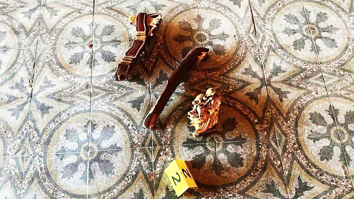 | Phần đầu rồng trên bệ tỳ tay và một số chi tiết của ngai vua triều Nguyễn bị bẻ gãy tại hiện trường. |