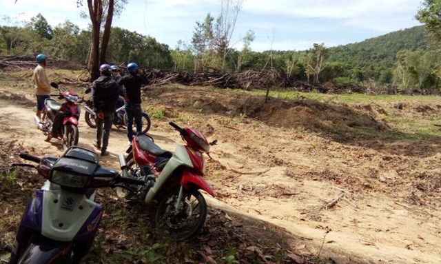 Một nhóm “cò” địa phương tìm mua đất làm rẫy vừa được đốt ở ấp 2, xã Cửa Cạn để bán lại cho khách.