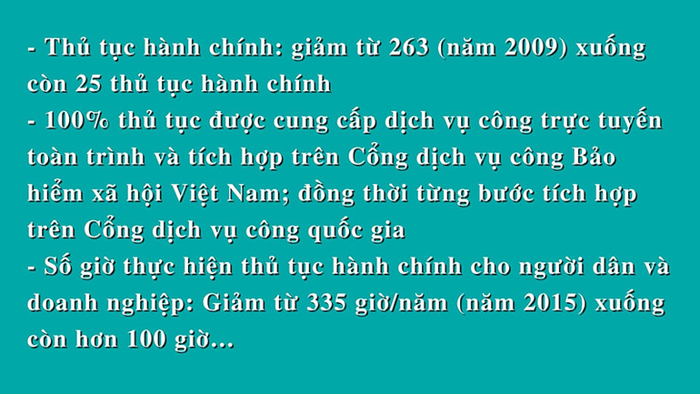 Theo đó, các thủ tục hành chính đã được rà soát, cắt giảm tối đa; đơn giản hóa, tái cấu trúc quy trình nghiệp vụ, đẩy mạnh giao dịch điện tử, cung cấp các dịch vụ công trực tuyến nhằm tạo thuận lợi nhất cho người tham gia; toàn bộ các quy trình nghiệp vụ giải quyết chính sách của ngành đều được thực hiện trên phần mềm liên thông, chia sẻ dữ liệu với các phần mềm nghiệp vụ khác và cơ sở dữ liệu của các bộ, ngành; công tác chuyển đổi số của ngành được tập trung triển khai quyết liệt và hoàn thành hầu hết các chỉ tiêu về xây dựng Chính phủ điện tử mà Quốc hội, Chính phủ đặt ra…