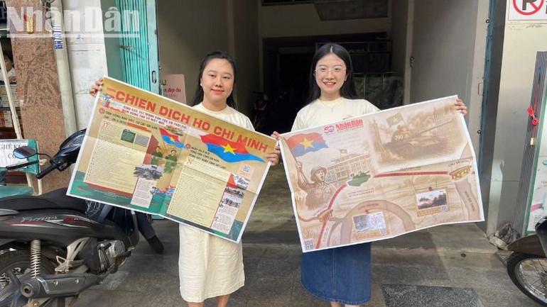 Các bạn trẻ check in với phụ san đặc biệt của Báo Nhân Dân kỷ niệm 50 năm Ngày giải phóng miền nam, thống nhất đất nước.