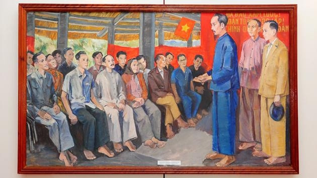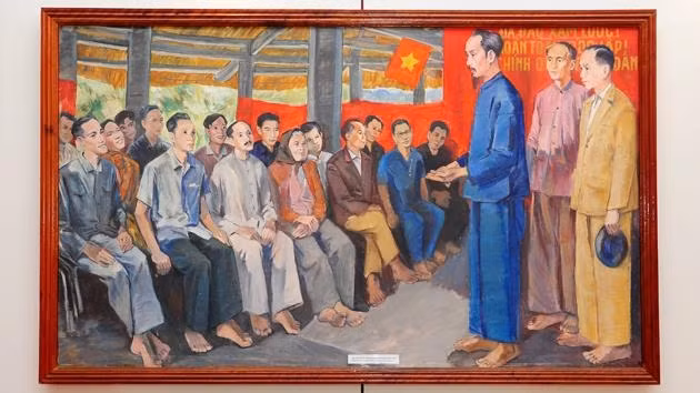 Bức tranh tái hiện Bác Hồ chủ trì Đại hội Quốc dân tại đình Tân Trào ngày 16/8/1945 để chuẩn bị tổng khởi nghĩa.