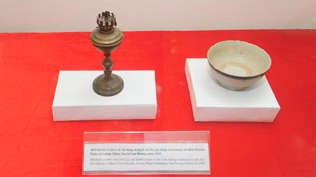 Đèn đồng và bát sứ dùng trong lễ ăn thề gia nhập cách mạng tại thôn Khuôn Trạm.