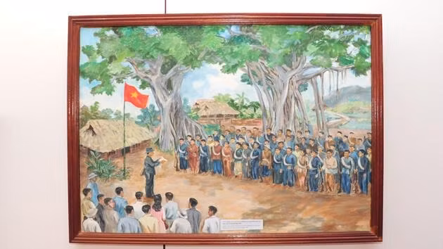 Bức tranh quang cảnh ngày thành lập Đội Việt Nam Tuyên truyền Giải phóng quân tại rừng Trần Hưng Đạo.