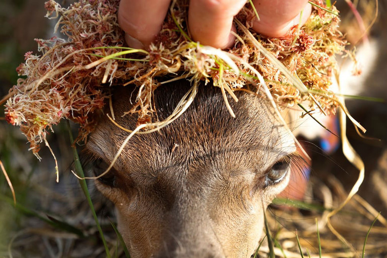 Các nhà khoa học bôi rêu lên người những chú hươu con nhằm tránh để lại mùi trên người chúng, tránh bị đồng loại dè chừng.