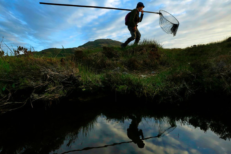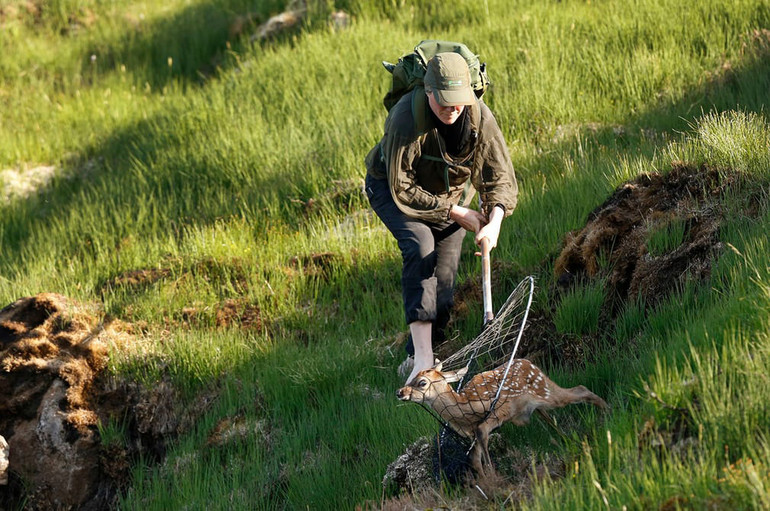 Một nhân viên bảo tồn với chiếc vợt lưới lớn để bắt hươu.
