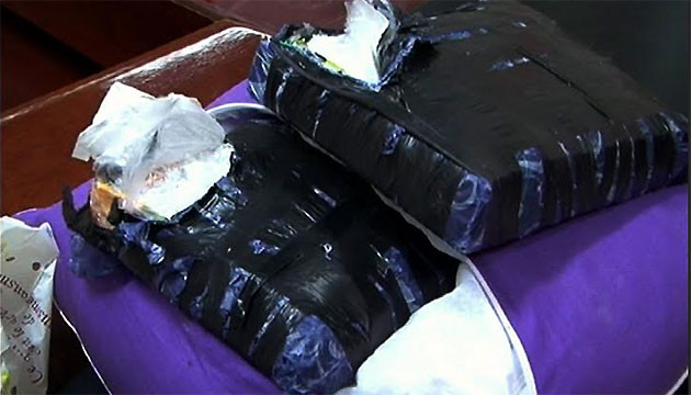 Tại đây, lực lượng chức năng đã phát hiện và thu giữ hai túi nilon chứa chất tinh thể màu trắng nặng 1525,29 gam và một túi nilon khác chứa nhiều viên nén hình trụ tròn có logo hình chữ “T” đã bị vỡ nặng 594,84 gam, giấu trong ruột một chiếc gối mầu tím. Kết quả giám định cho thấy, toàn bộ ba túi nilon trên đều là ma túy tổng hợp có trọng lượng 2.122,97 gam.