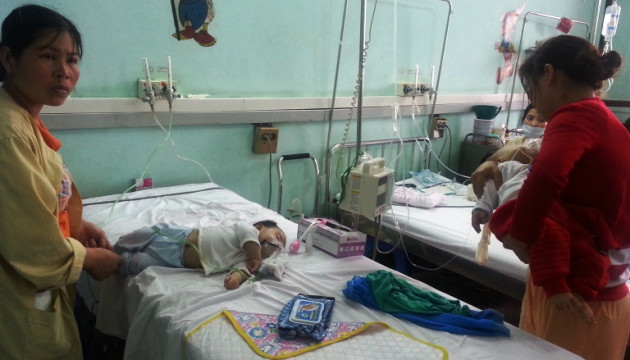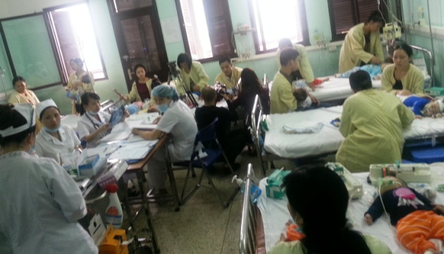 Sáng 4-4, tại Khoa Hô hấp A16 – Bệnh viện Nhi Trung ương, phòng có bảy giường thì đã có đến 30 bệnh nhi, cứ ba đến bốn cháu phải nằm chung một giường. Bố mẹ các bệnh nhân người đứng, kẻ ngồi ôm con giữ ống thở cho con. Tiếng máy móc, tiếng gọi bác sĩ, điều dưỡng liên tục vang lên. Không khí vô cùng ngột ngạt.