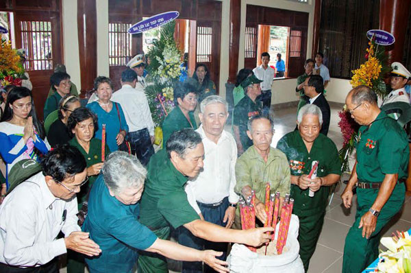 Các Cựu TNXP đốt hương tưởng niệm đồng đội đã hy sinh tại Đền bia tưởng niệm.