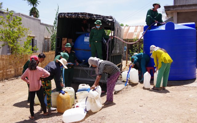 Bà Mang Thị Hiển, thôn Dân Hiệp, xã Thuận Hòa phấn khởi cho biết, từ hôm Tết một số giếng trong xóm do Nhà nước đào thì còn. Nhưng đến bây giờ thì dần dần khô hết, giếng nào cũng khô hết, từ giếng cá nhân cho đến giếng nhà nước đào. Bà con phải tích góp tiền mua nước để dùng, cứ một téc nước (1m3) là 100.000 đồng. Bữa nay, nghe tin có bộ đội chở nước tới, nhà nào cũng mang vật dụng đựng nước tới điểm cấp nước để chở nước về dùng, không còn phải đi mua nước nữa, bà con vui lắm.