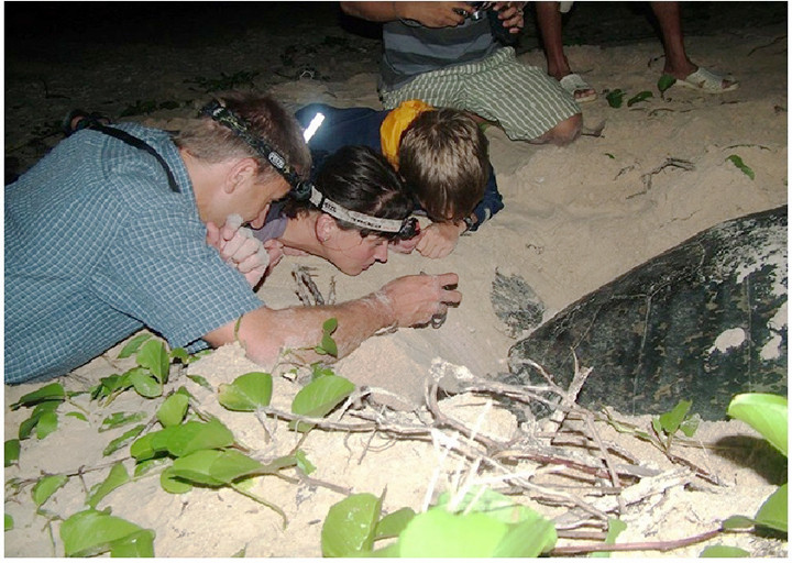Một nhóm du khách quan sát cảnh rùa biển đẻ trứng ở Vườn quốc gia Côn Ðảo. Ảnh: Vietfuntravel.com.vn