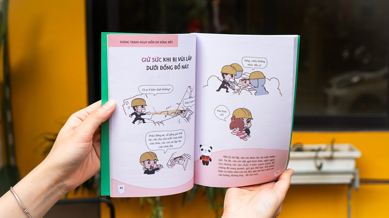 Cuốn "Ứng phó với thiên tai" giúp trẻ học cách xử lý các tình huống khẩn cấp như động đất, bão lũ, sạt lở, mưa bão sấm sét…