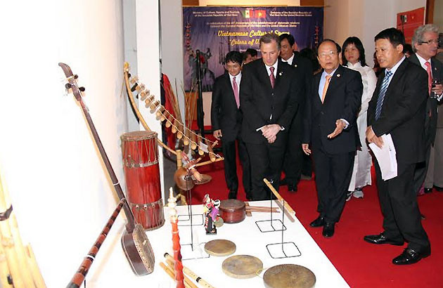 Trưng bày nhạc cụ truyền thống và trang phục các dân tộc Việt Nam.