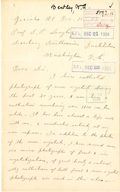 Sau khi chụp thành công những bức ảnh đột phá, những bức đầu tiên trong số hơn 5.000 bức ảnh được chụp, ông Bentley háo hức được chia sẻ khám phá của mình với thế giới. Năm 1904, ông tiếp cận thư ký Viện Smithsonian Samuel Langley với 500 bức ảnh đẹp nhất của mình.
