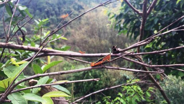 Loại cào cào thân đỏ tràn ngập trên cây trồng ở xã Thịnh Vượng, phía sau là hàng loạt bụi tre đã bị ăn trụi lá.