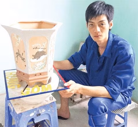 Học viên Đặng Việt Hưng trong giờ thực hành nghề làm gốm.